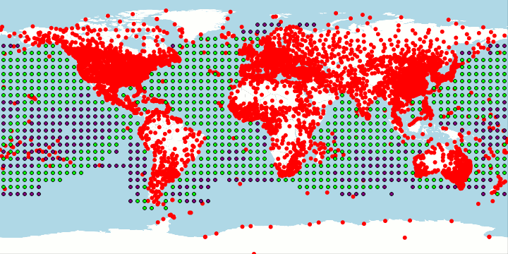 | All 884 ocean stations (from GHCN adjusted+ocean) - green have data, purple do not, red are land/not selected